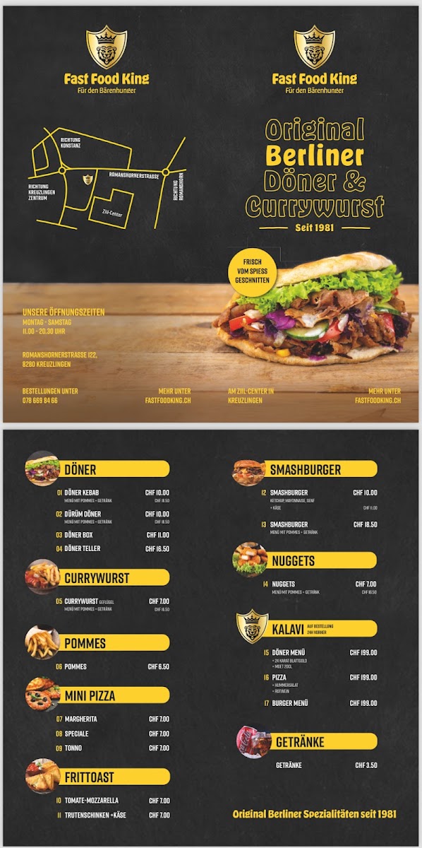 Introducing the menu at Fast Food King, located in the heart of Neuhausen am Rheinfall, Switzerland, is a culinary delight that tantalizes the taste buds. As highlighted by satisfied customers, their Döner is a standout, featuring fresh, juicy meat paired with perfectly crisp bread. Reviewers rave about the homemade sauces that elevate each bite, showcasing the commitment to quality and love for food.